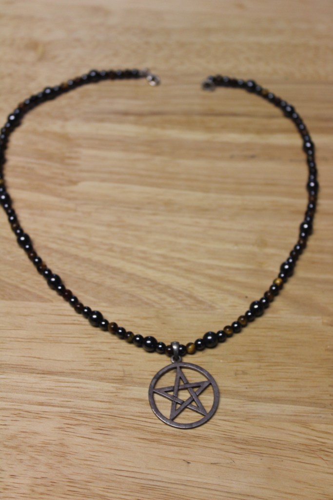 Update: This is the pendant I now wear. It’s a tiger’s eye and hematite strand with a silver pentagram. Blessed be!