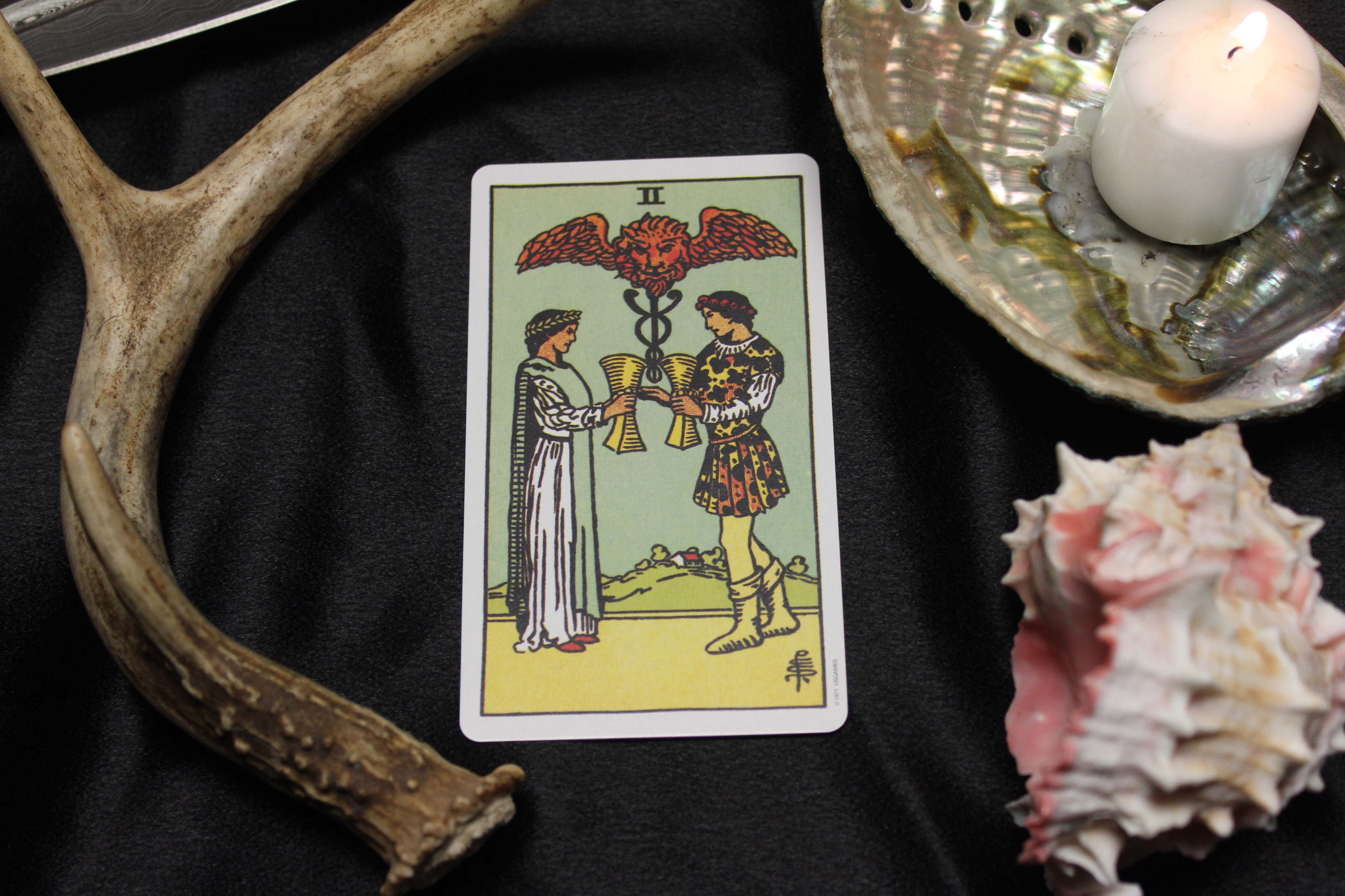 The Two of Cups shows us a pledge between two young people, or perhaps a sumbel of some sort. A.E. Waite says this card represents the union of the sexes, but also friendship and affinity.
